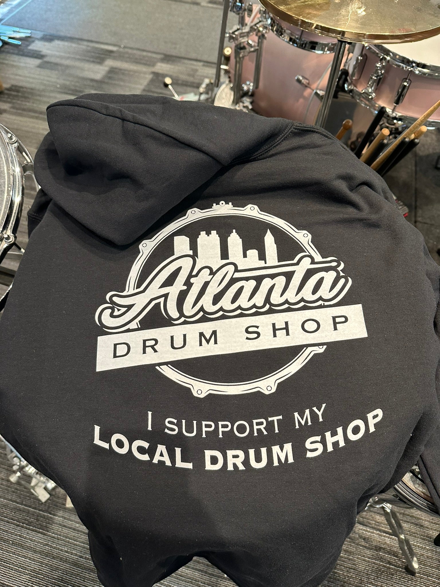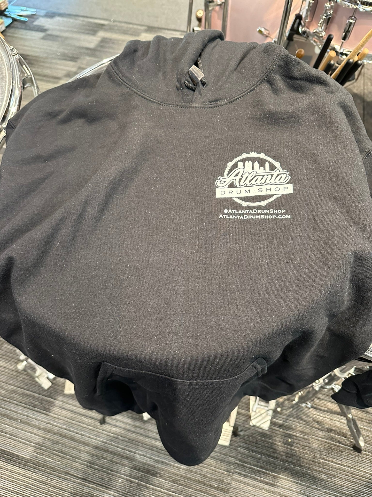 Support your drum shop and look mad stylish in the Atlanta Drum Shop black hoodie with white logos, front and back.