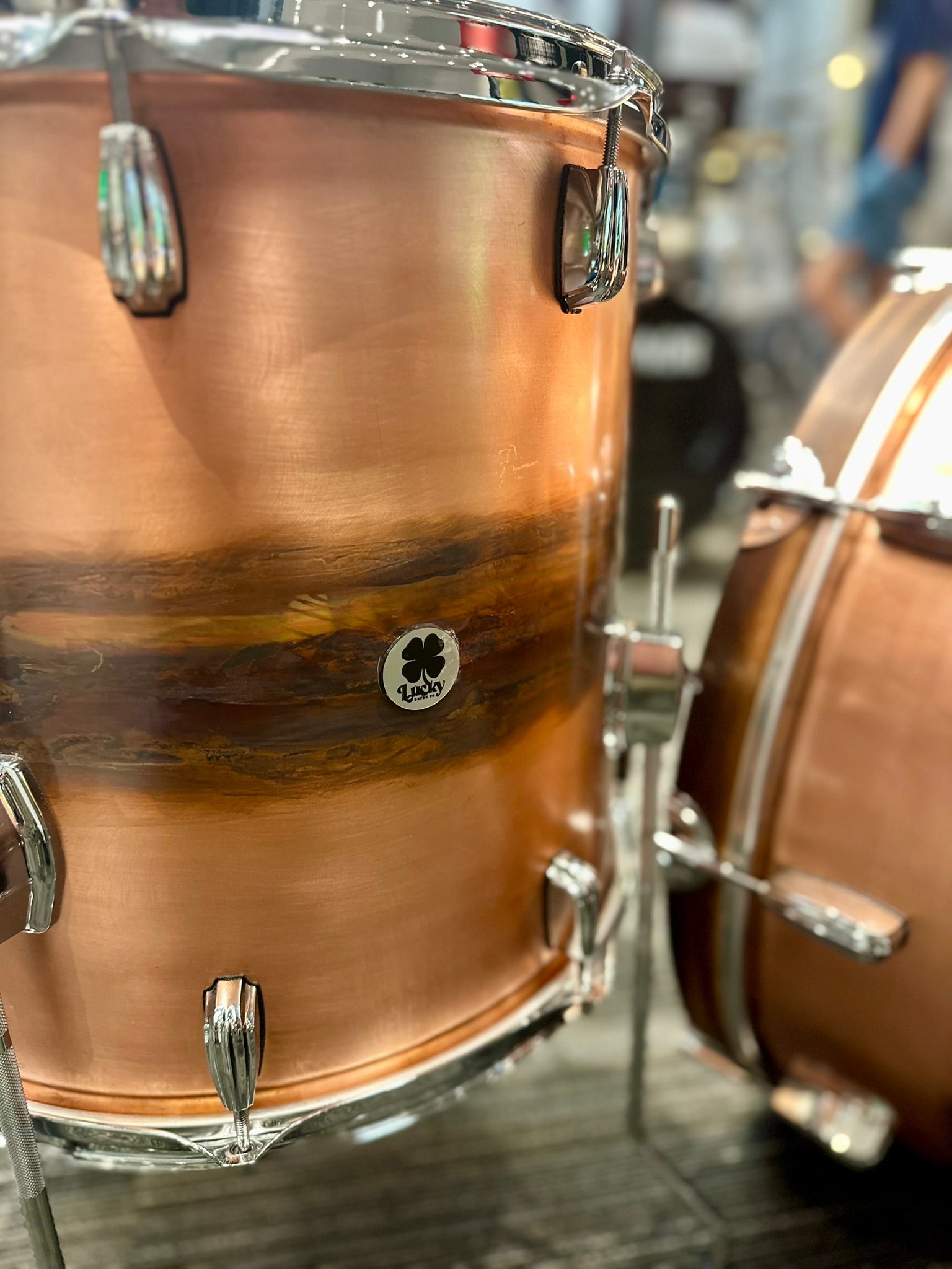 This amazing kit is made locally by Lucky Drum Company. The shells are copper and provide a boom and warmth as if they were wood. An identical set was bought by Rick Beato of YouTube fame here in the shop. Also notable is that Micah Schweinsberg of the band Diamond Rio plays a very similar kit.