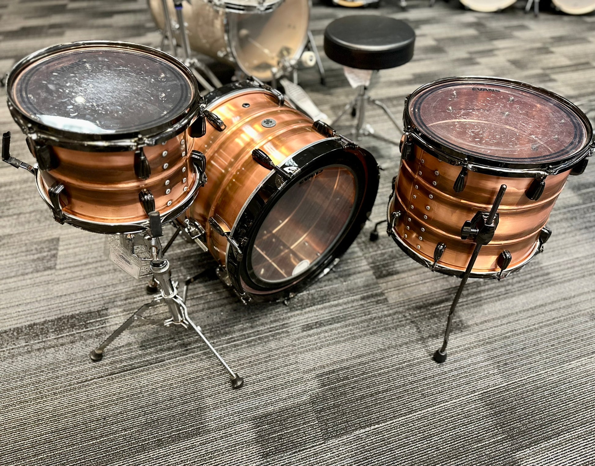 Lucky Drum Company, a *LOCAL* drum maker has hit yet another grand slam with this portable, yet massive-sounding copper kit. Sizes are 18/10/14 which are fantastic for throwing into your car/truck and setting up for your next gig. Don't let the compact sizes fool you; all three drums sound massive. Lots of bottom end and big projection.