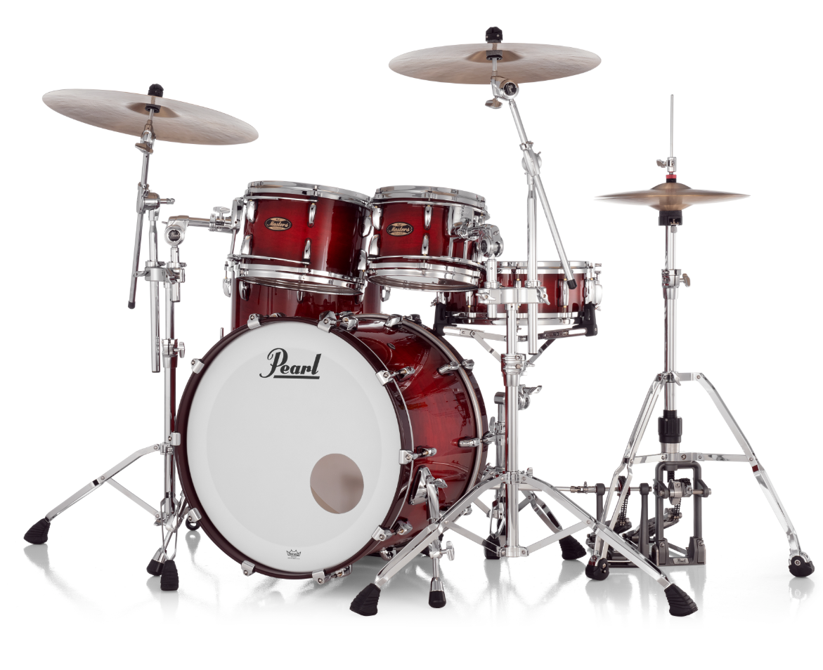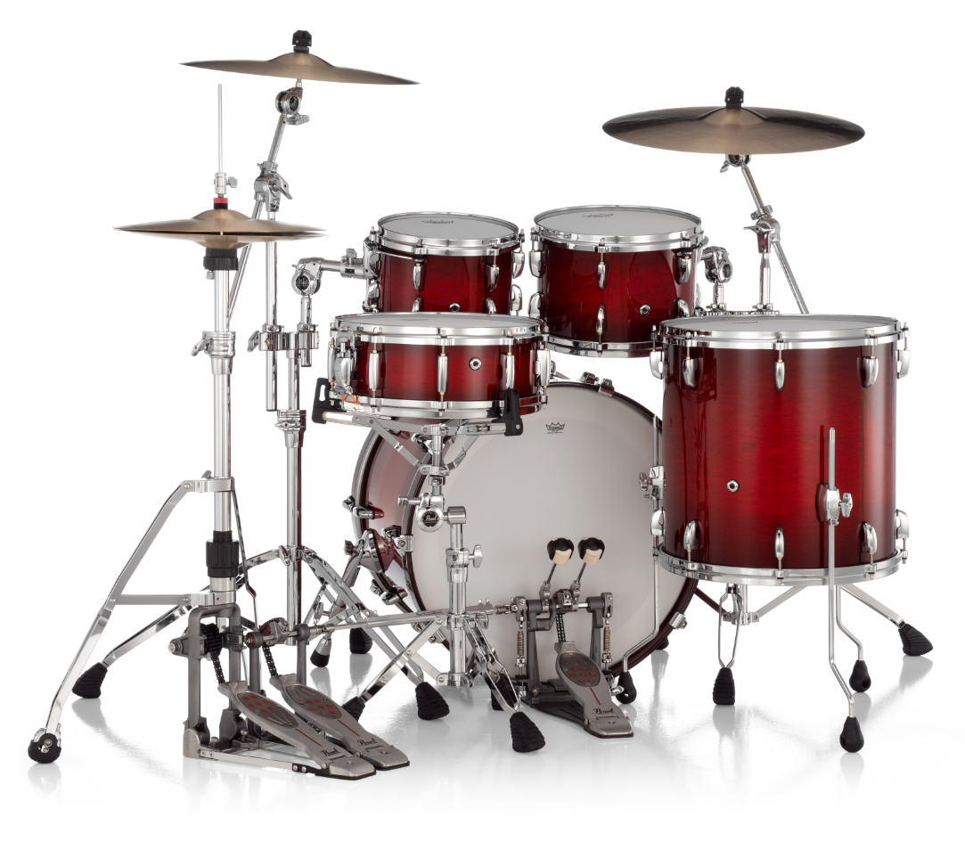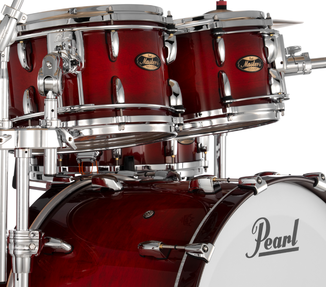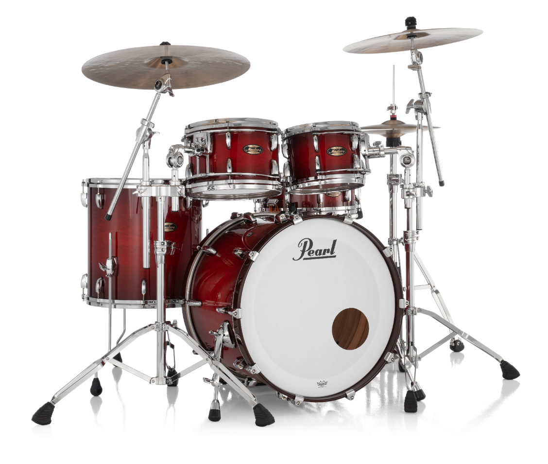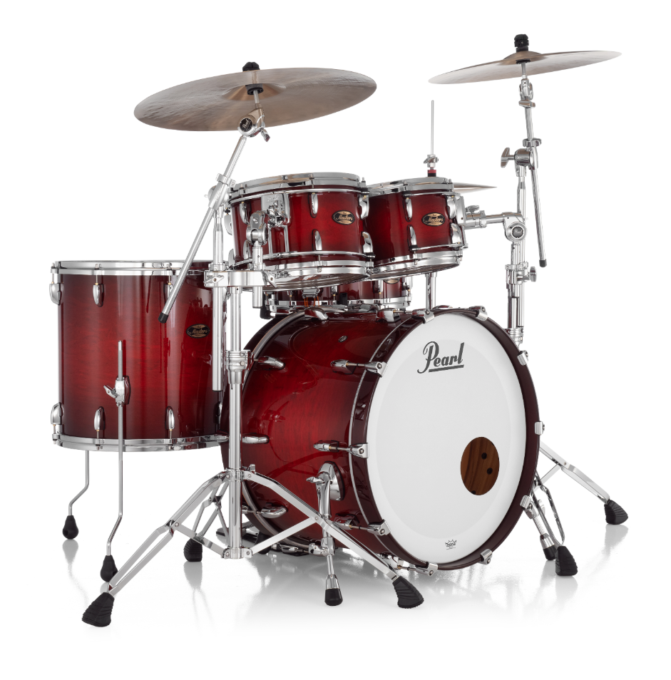 Pearl Masters Maple Gum 4 Piece Shell Pack Featuring 22"x16", 16"x16", 12"x8", 10"x7" Drums in Deep Redburst with R2 Air Tom Suspension System with 7/8" Standard Bracket