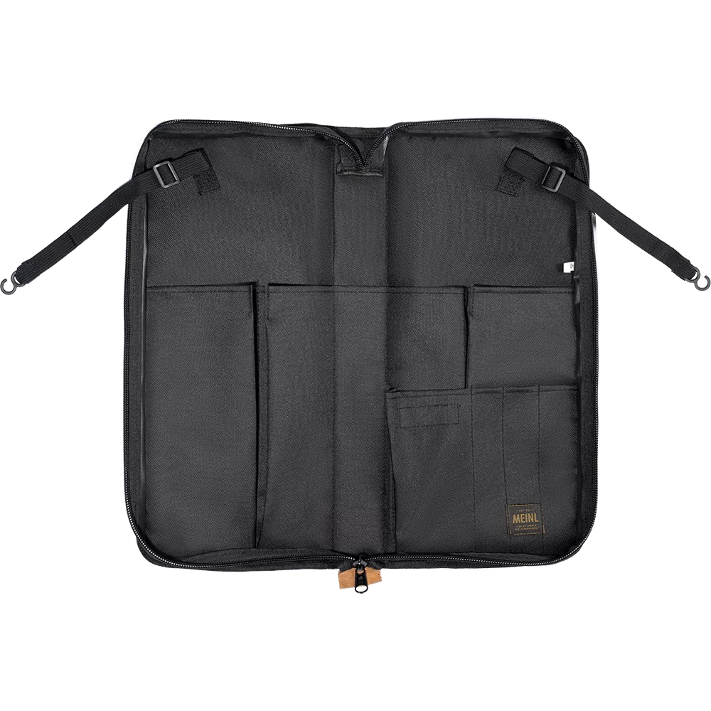 The Meinl Classic Woven Stick Bag has all the tough useability of a touring bag with timeless good looks. Our ultra-durable, heavyweight 600D woven polyester exterior fabric is backed with a PVC lining for extra toughness and structure. Plus, it features suede leather accents along the bottom and zipper tape. Inside the main compartment are five pockets to organize a large number of drumsticks, brushes, rods and mallets (4 large gusseted pockets and 1 bonus pocket on the binding). Plus, there are four smaller sized accessory pockets to accommodate parts or sound effects. This stick bag comes equipped with length adjustable floor tom hooks and straps to suspend it in an open position. For quick access storage, the large exterior pocket is sized for common accessories or tools, and it zips shut to secure your items. An adjustable/removable shoulder strap and reinforced, thick webbed handles let you comfortably transport this bag to the gig or studio. Getting into the bag is easy with the large zipper tabs that pull in both directions. The Meinl Classic Woven Stick Bags are designed for functionality and style for any type of traveling drummer.