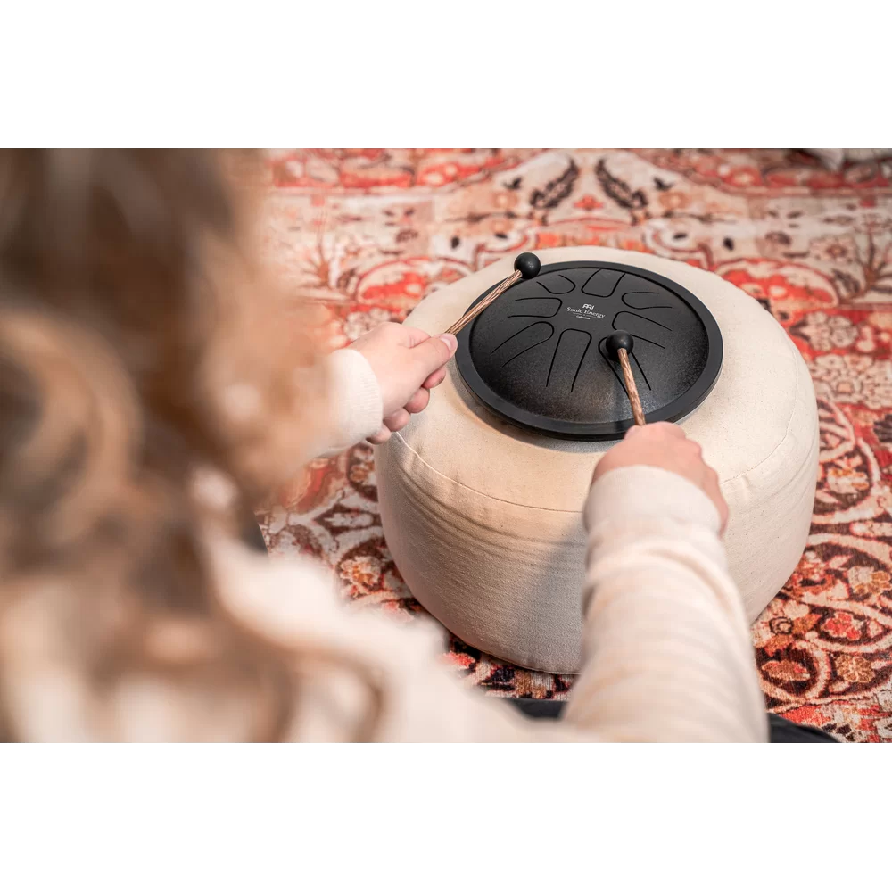 The 7" diameter drum may be played by anyone, anywhere, regardless of skill. Its pre-tuned scale means there are no wrong notes, and the sound is ethereal and soothing (like a soft steel pan drum).