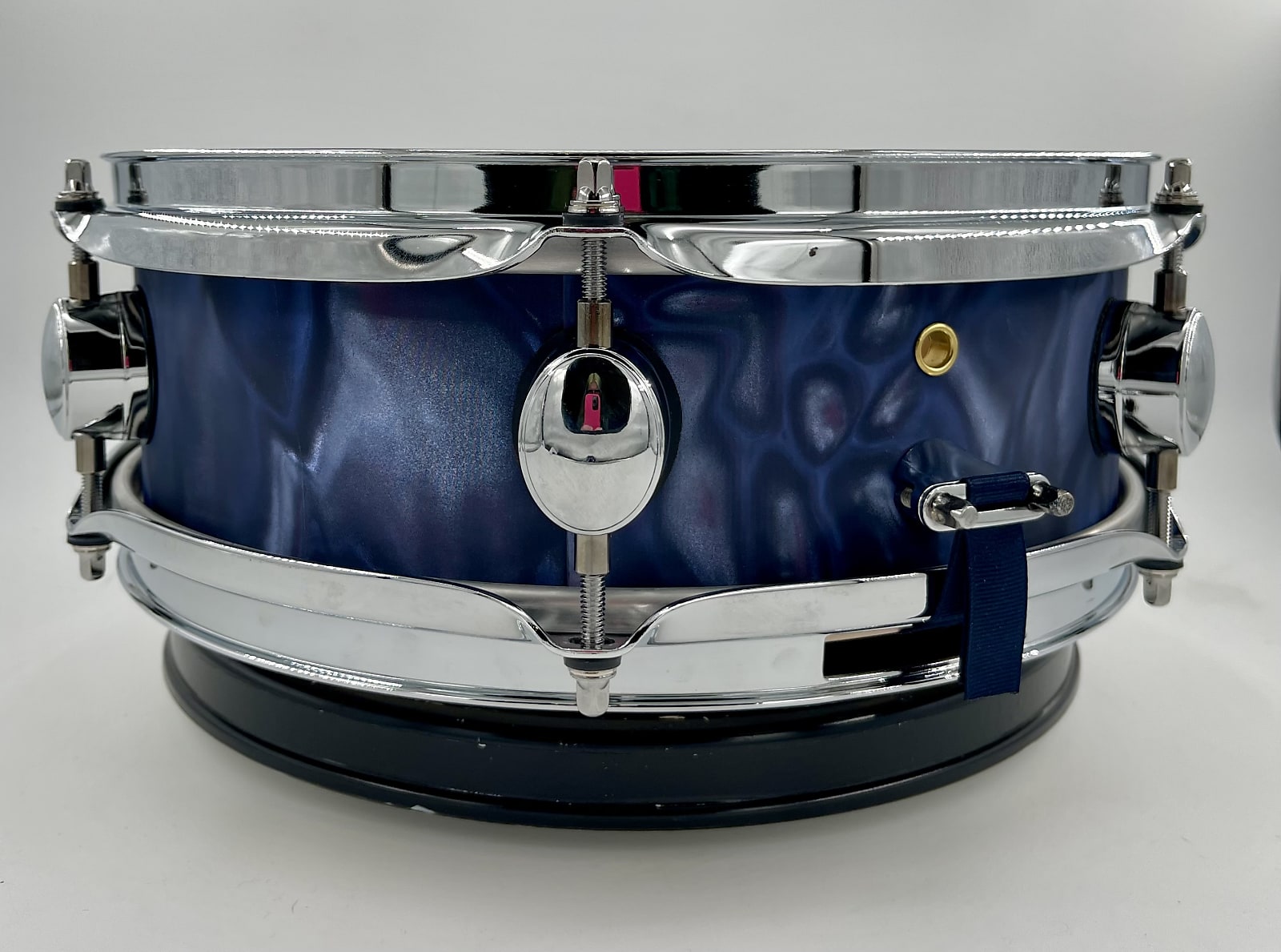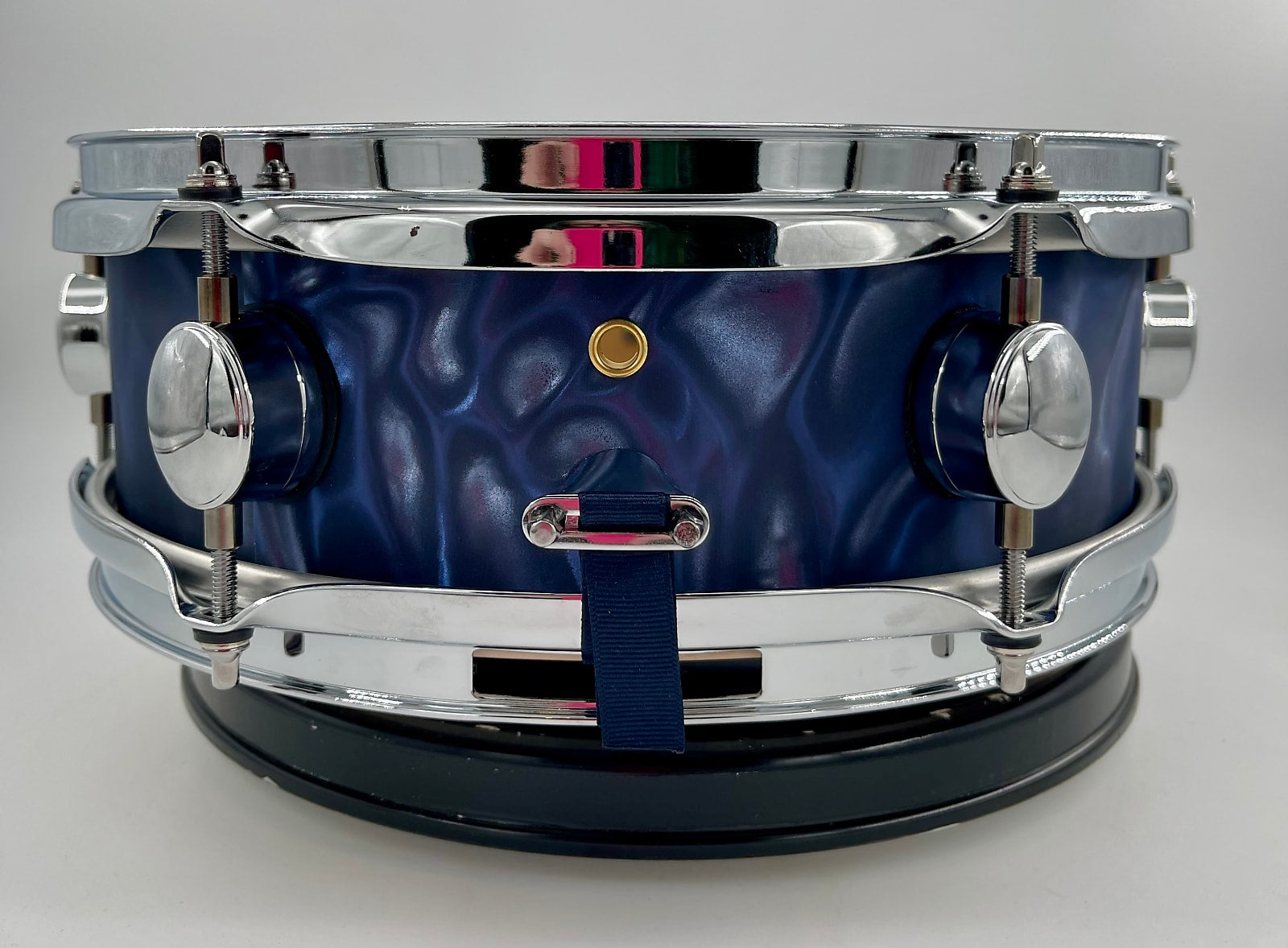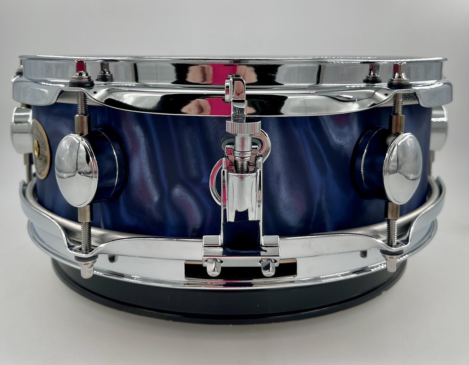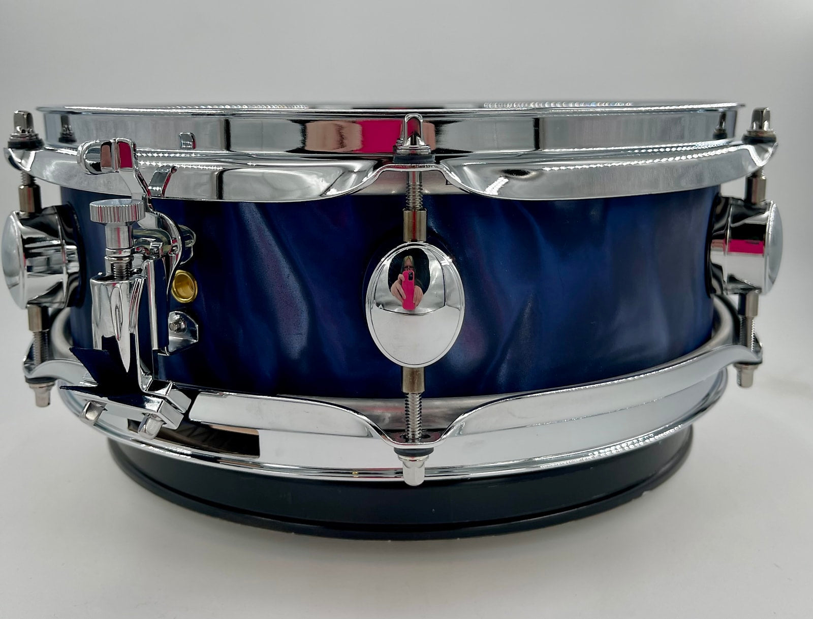 All drums by Montineri Drum Company are custom master-crafted. This 12"x4" snare is made from 10-ply Maple and wrapped in a brand new beautiful Blue Satin Flame wrap. She sounds just as good as she looks.