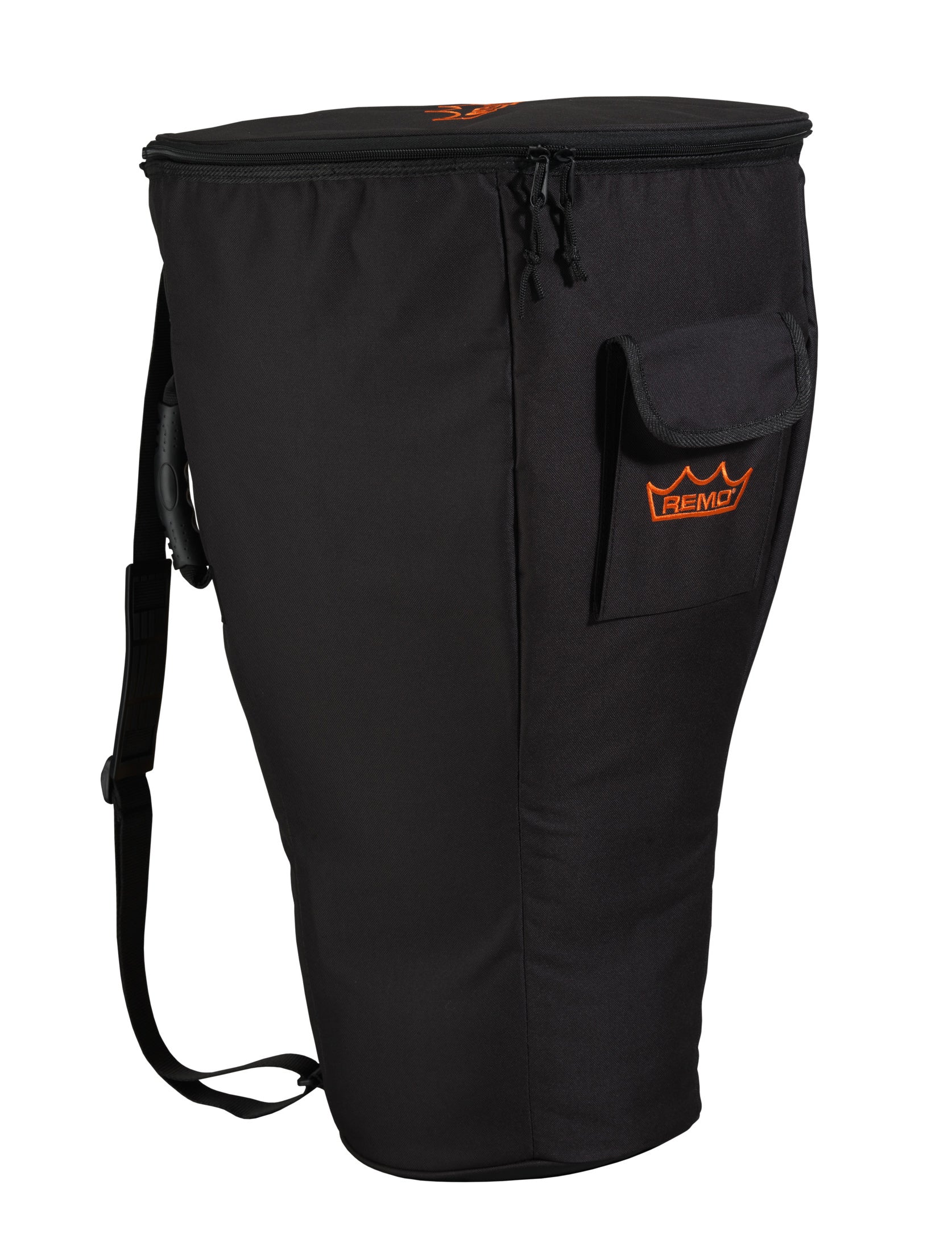 Deluxe 14 inch Black Djembe Bag by Remo. Easy to carry by the shoulder straps or by the comfort grip handle. The bag is constructed of padded, heavy-duty canvas. There is a convenient side pocket to store tuning keys and other small items. This Bag was designed to accommodate the 14 inch Remo djembes. The bag height is 26 inches. The top diameter is 16 inches, and the bottom diameter is 10 inches.