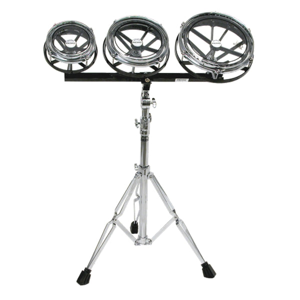 The Rototom® Set is constructed with a rapid-tuning system, allowing for instant tuning in a range of more than one octave. The Rototom® Set does not have a traditional drum shell. Instead, the drumhead and counterhoop are mounted on an aluminum frame (spoke) through which the tension rods are attached to a bottom frame which is mounted on a threaded center bolt. Rotating the frame raises or lowers the tension, thus raising or lowering the pitch of the drum. Their versatility has led to the widespread use of Rototom®s in live situations, recording studios, percussion ensembles and symphonic Concert music. Rototom® Sets feature two or three Rototom®s mounted on a single stand for versatility and convenience. Available in a set of sizes: 6 inch., 8 inch., and 10 inch. with stand.