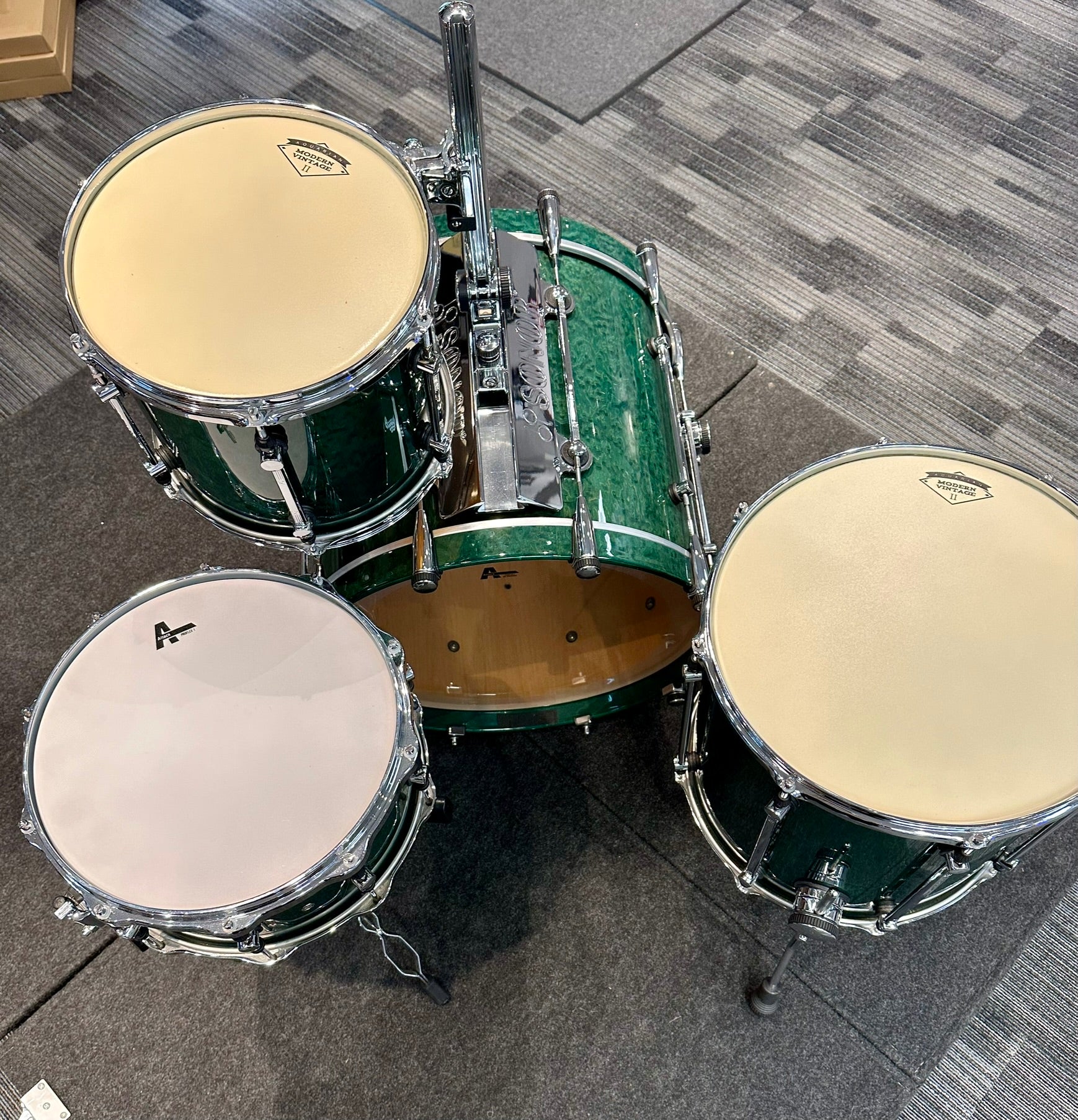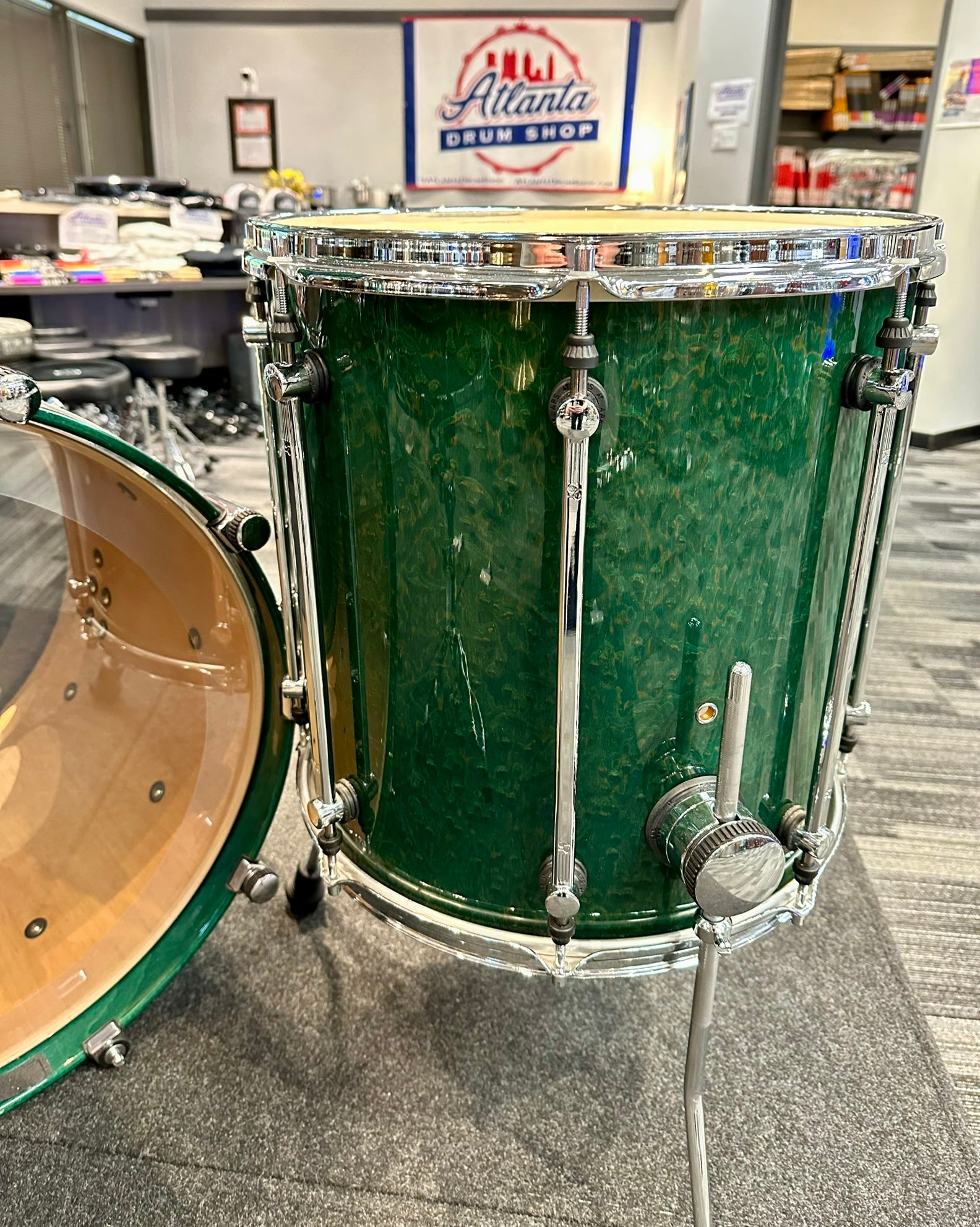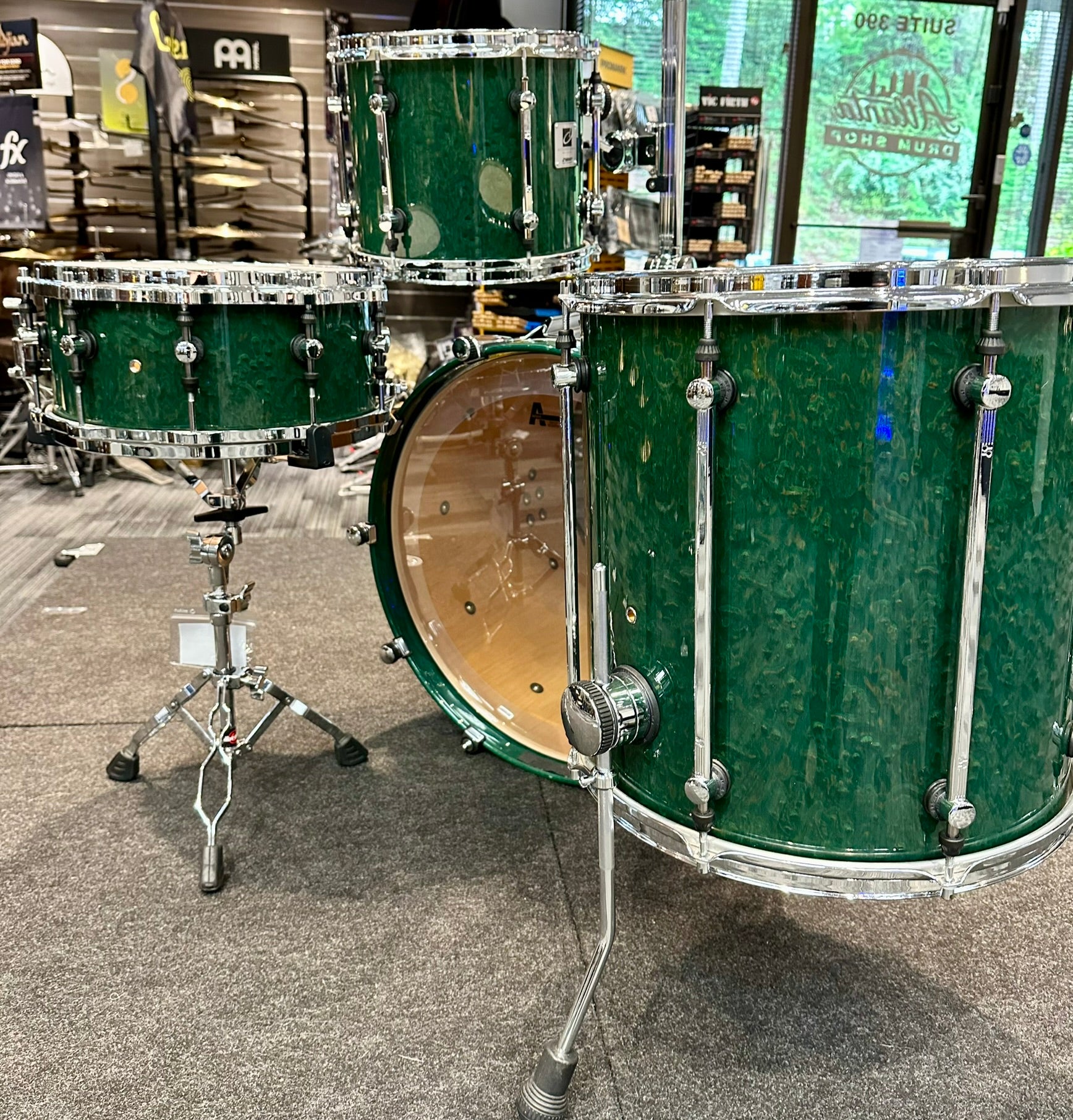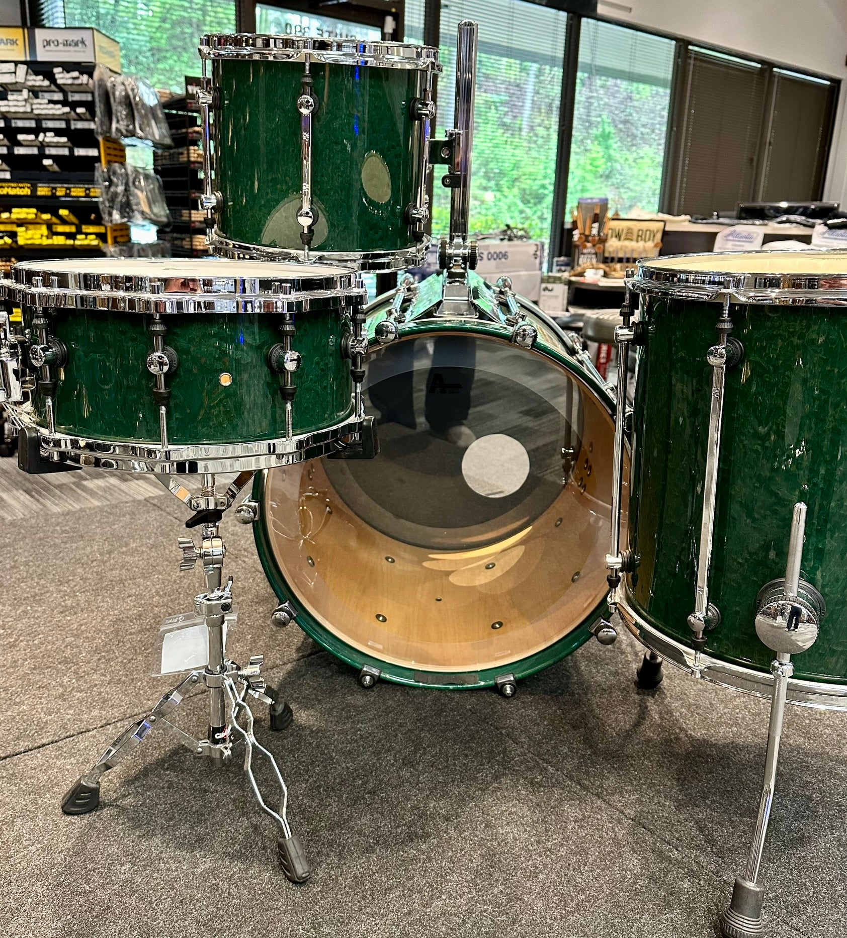Gorgeous Designer Maple Light kit in Green Stain. 4-piece including matching snare. 22x18, 12x10, 16x16 and 14x6.5. Bass drum features the "rocket launcher" style tom mount. This finish is even more gorgeous in person. Please listen to the audio/video demo to hear these beauties. Available for pickup at the Atlanta Drum Shop - 2030 Powers Ferry Road Suite 390 Atlanta, GA 30339. Shipping is available at our cost via UPS Ground.