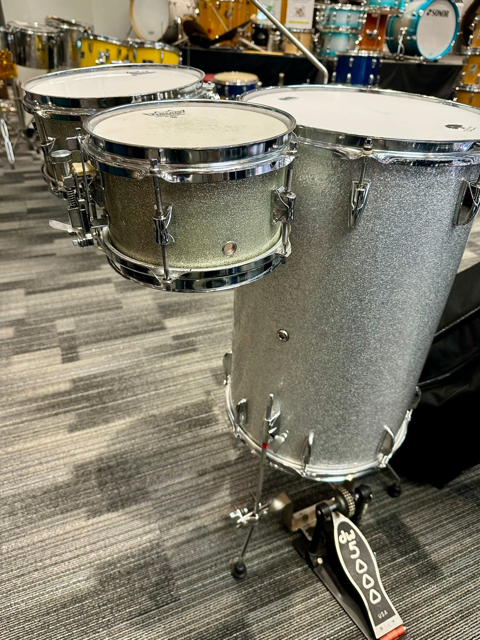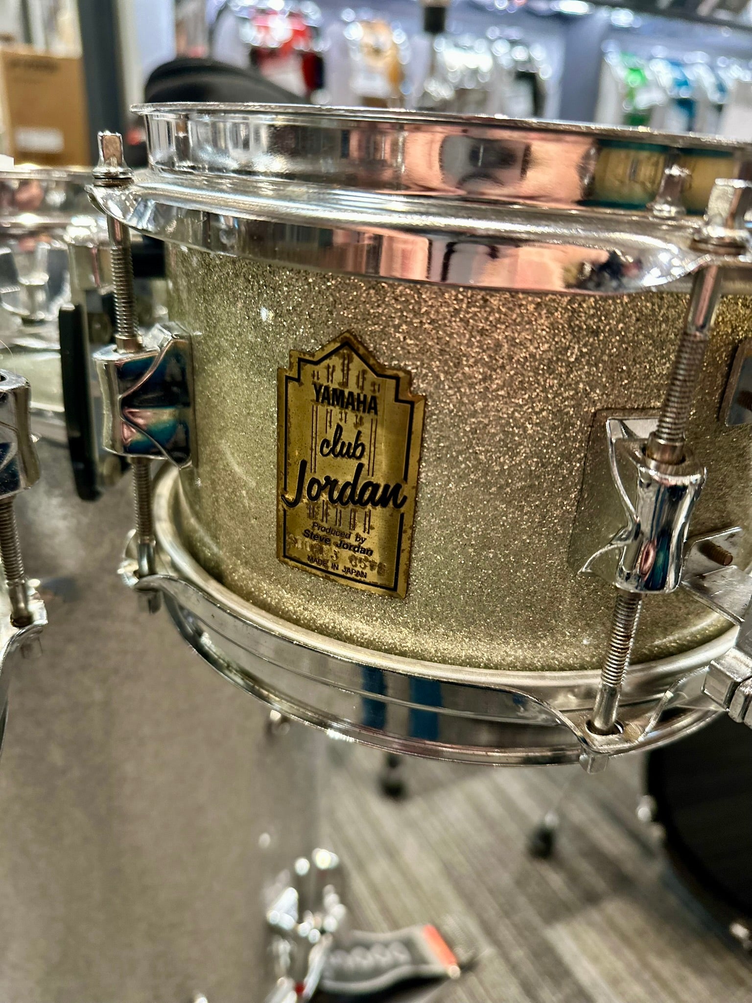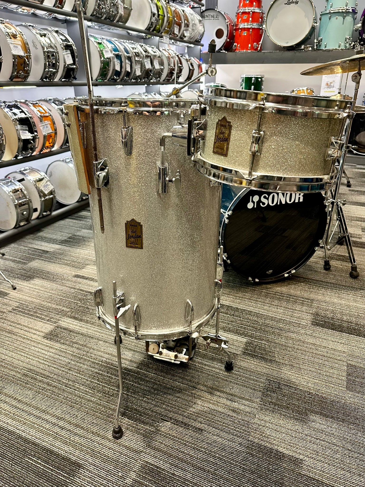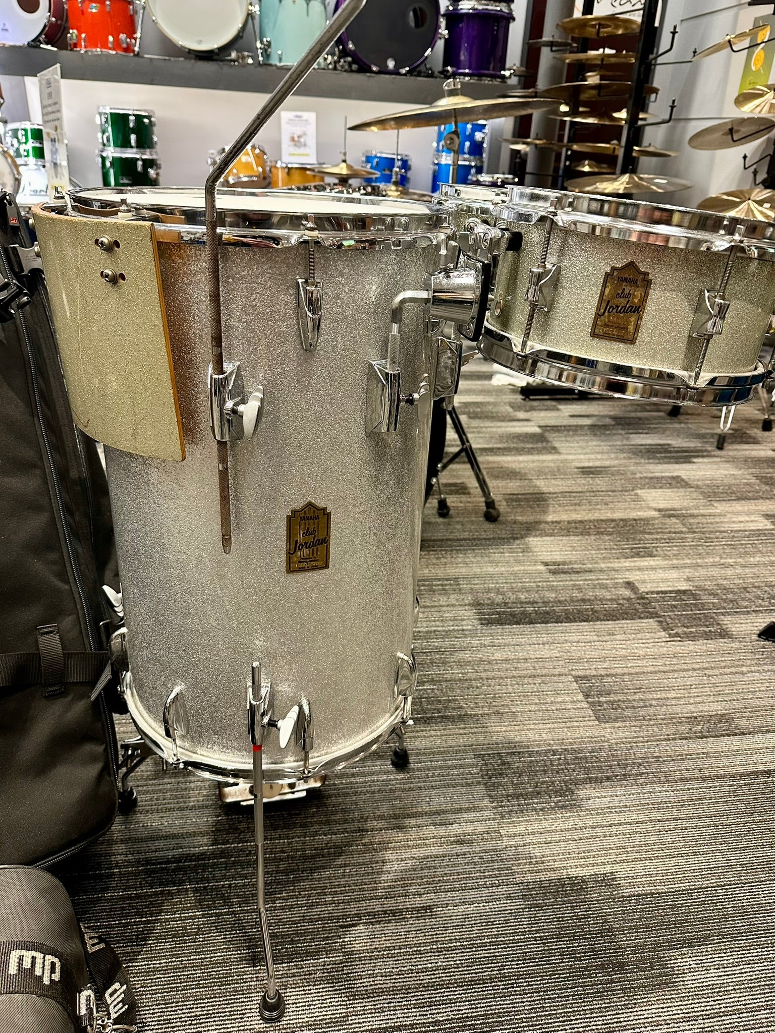 Very good condition Club Jordan cocktail kit in Sparkle Sparkle. Everything is there and original; the main bass drum/tom has been professional wrapped by Paul Montineri of Montineri Custom Drums. The original finish had scratches and yellowing of the lacquer. This setup functions great and sounds fantastic.