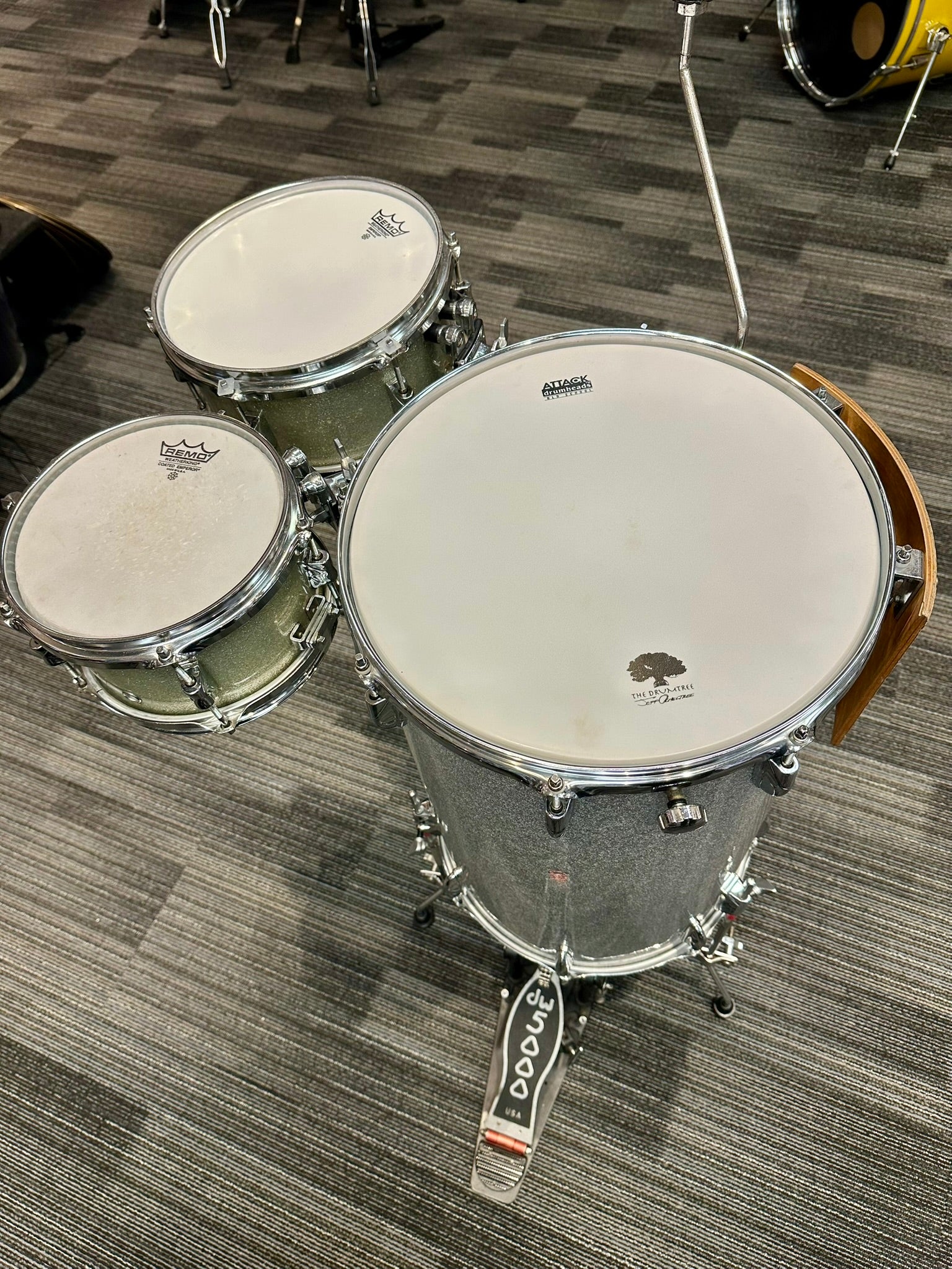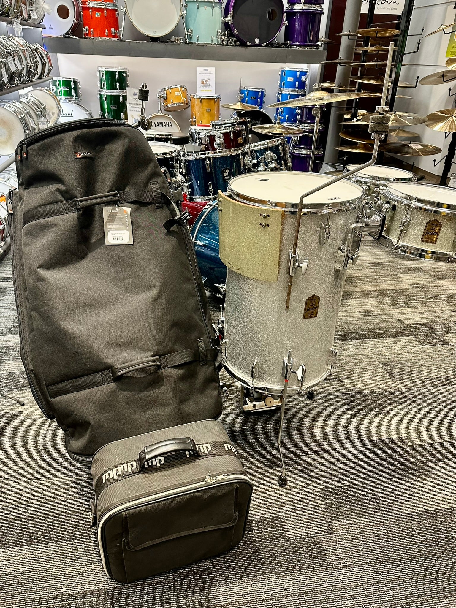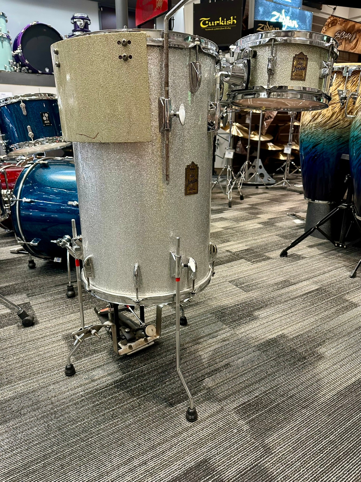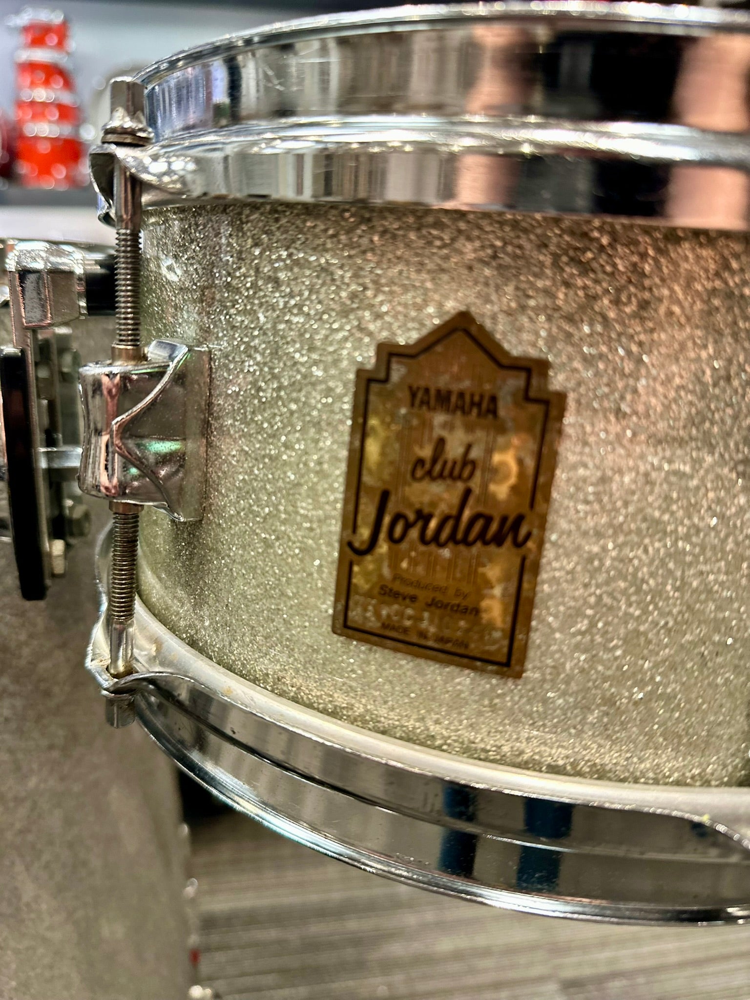 Very good condition Club Jordan cocktail kit in Sparkle Sparkle. Everything is there and original; the main bass drum/tom has been professional wrapped by Paul Montineri of Montineri Custom Drums. The original finish had scratches and yellowing of the lacquer. This setup functions great and sounds fantastic.